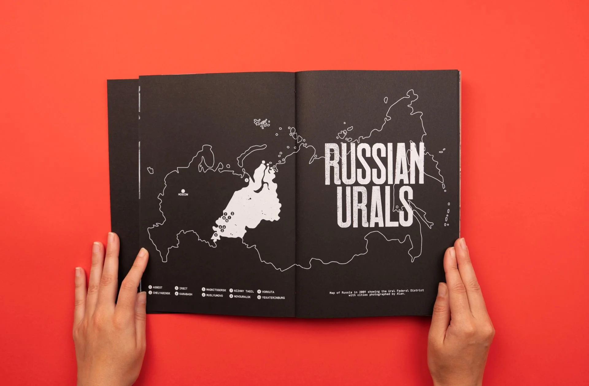 Conceived by Emily Macaulay, Chloe Juno and Jenny Christensson, the Swiss-bound photobook features 182 colour photos by Alan Gignoux, some presented as foldouts. Book designer Emily Macaulay created a foldout photomontage for the start of the book and four “wallpapers” made with cut-outs from Gignoux’s photographs, which are interspersed throughout. The book includes an introductory essay about the history of the Russian rust belt, a hand drawn map of the Ural region with the cities Gignoux visited, and ten city biographies - single page essays giving a brief industrial history for each of the locations. The arresting typography for the titles throughout was created by graphic artist Anthony Burrill using a Russian woodblock typeface supplied by Partisan Press, a Moscow based letterpress studio.